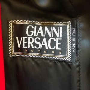Giani Versace Couture. Stunning, gorgeous color, amazing style, incredible designer label! This coat has silver studs on both collar & cuffs including stud has Versace face on it. Underside of collar & flaps of pockets are lined with soft black leather. Covered button placket is lined with a black satin. Label stating material has been removed at neckline so it is my best guess that this is 100% cashmere or Angora/cash blend. Excellent Cond. SZ 42/US6 32" long 16.5" shoulder 18.5" bust. Excellent condition!