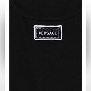 Versace ribbed knit tank top in black featuring an embroidered logo patch. Lots of stretch. Size 5/XL. Worn once. Comes with original Versace box.