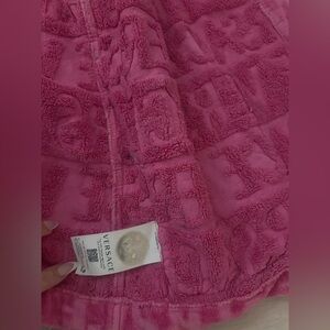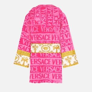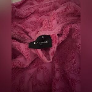 “I love baroque short bathrobe” - Versace. 100% authentic. Worn, see photos, price reflects. For reference I am 5’4 and it just covered my bottom area. Has hood attached.