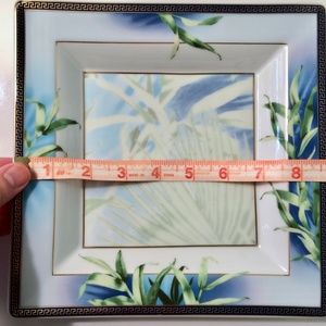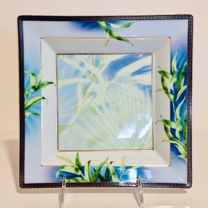Versace x Rosenthal Jungle Decorative Large Tray or Serving Dish / Plate. Features the Jungle pattern, modeled after Jennifer Lopez's iconic Versace Grammy dress, and gilded dark blue Greek Key border. Approximately 8.5 inches squared. Authentic and Made in Germany of fine porcelain. Excellent pre-owned, vintage condition - no chips or cracks. The Jungle pattern was discontinued in the early 2000's. Current patterns of this tray size retail for $440. No box.