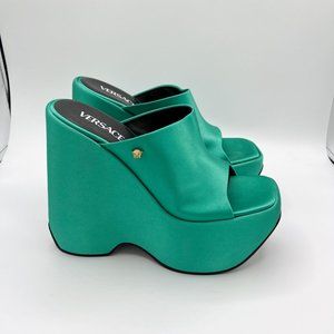 Bold and daring, Versace's mules are made in Italy of luxurious satin enhanced with a squared toe. This pair is anchored by a striking wedge heel and platform.