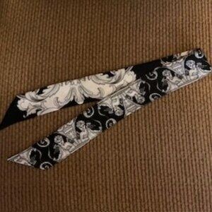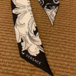 Versace’s “twilly”. Crafted from pure silk twill, this scarf tie features a white/silver baroque pattern on a black background. It has a cherub motif on one side and classic Versace scrolls motif on the other. It is in like new pre-owned condition. No signs of wear. Measures 34.3 X 1.9 inches.