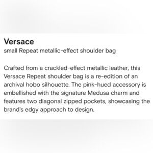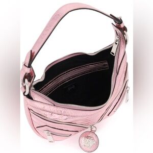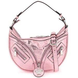 Crackle-effect leather in metallic pink featuring the iconic Medusa head charm and two diagonal zipper pockets. Edgy yet feminine style! Giftable!