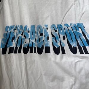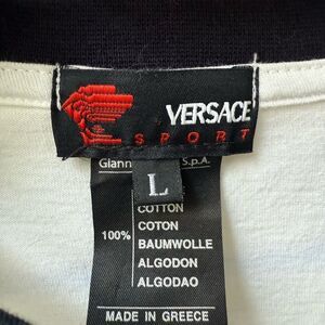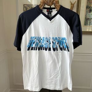 Versace sport men’s Raglan V-neck logo T-shirt featuring Versace Sport in rippling water logo across the front . The short sleeves and V-neck trim are dark blue. 100% cotton. Made in Greece. Laying flat measures 28.5 inches shoulder to hem and 21 inches armpit to armpit.