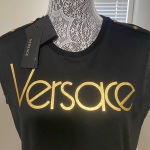 New with tags Versace T-shirt. Tag says t-shirt but this garment can also be worn as a dress or tunic, it also has two pockets with button details on each shoulder.