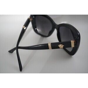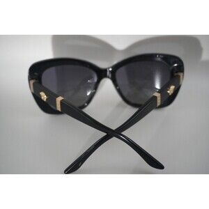 Pre-owned with case Versace VE 4305Q Gold Medusa emblem Greca design Luxury Black acetate frame, UV Protection. These Versace sunglasses feature a bold black acetate frame with a sleek, glossy finish. The oversized round lenses provide a statement look with full UV protection. The standout design element is the gold-tone Medusa head emblem on the temples, surrounded by signature Greca pattern detailing. The temple arms are wide for added style and comfort, while the luxurious gold accents elevate the overall aesthetic. These sunglasses embody Versace's iconic blend of opulence and fashion-forward design, perfect for making a powerful style statement.