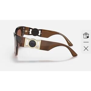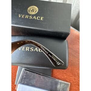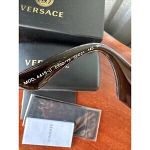 The Versace VE 4415U 108/3 Havana Plastic Cat-Eye Sunglasses in brown feature a stylish cat-eye shaped frame with a havana patterned matte finish and brow. Made of plastic, these sunglasses are designed for women and are crafted in Italy, showcasing the quality and craftsmanship of the Versace brand. The brown lens adds a touch of sophistication to the overall look, making these sunglasses a trendy and fashionable accessory for any outfit. These are authentic purchase directly from a retail store in California never wore them.