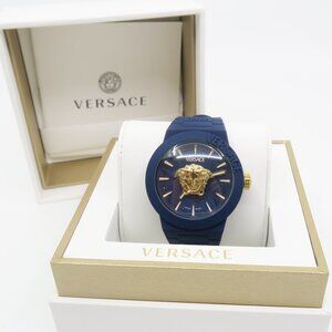 Versace VEEFA0524 V-Pop Blue & Gold Medusa, Silicone Swiss Quartz New Watch. Movement: Ronda 762 Swiss Quartz 2-hands movement. This modern unisex watch color is matte blue, with blue inner dial, a a large 3D gold center Medusa with Greca inner ring and Versace logo at 12hour. The case is made of stainless steel with gold crown. Case: 1.7" / 43 mm. Water Resistant 3 ATM or 30 meters or 100 feet. The bracelet color is also blue silicone strap with 3D Greca pattern on the silicone Band. The buckle is gold made of stainless steel. Made in Switzerland. The accessory comes in a white and gold Versace gift box watch case with the authentication paperwork. Original Versace tag is attached to wrist watch. Retail $595.00.