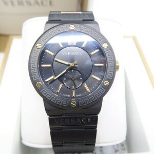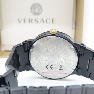 Versace VEVI00620 Greca Logo Matte Black 41mm., Quartz, New Watch for Men. 100% Authentic. This classic and elegant contemporary stainless steel watch is characterized by the matte black Greca color, fixed bezel, enriched with the matte black dial and 3D gold Versace logo head at 12H and white Versace letters. there are gold screws around the bezel with a go;d crown. The chronograph representing seconds, luminous hands and indexes. This is a round dome shaped watch with sapphire crystal, Swiss quartz movement with battery. The bracelet is also matte black made of stainless steel with butterfly (deployant) buckle and black Versace letters printed on the links. Water resistance up to 5 ATM. Made in Switzerland. Serial number engraved at back of case. Original Versace tag is attached to wrist watch. Watch is shipped with all original boxes, paperwork, authenticity card and a 2 year warranty from the manufacture. Retail $1545.00 .