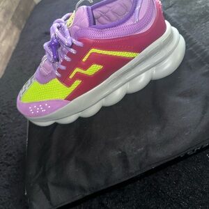 Eye-catching Versace sneakers in vibrant purple and lime. Bold design with a sleek sole. Brand new still in box never worn!