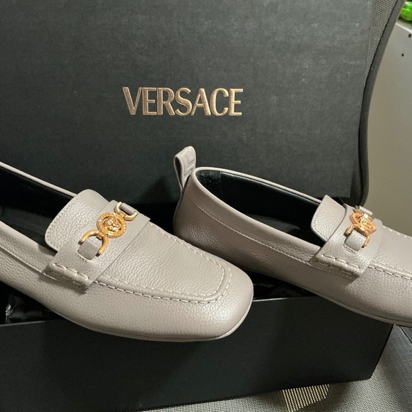 Brand new. Never worn. In box with dust bags and all cards. Smoke grey color. Size 40 EU. Will fit women size 9-9.5. I’m an 8-8.5 and they are a bit too big for me. Otherwise I’d be keeping them for myself. Beautiful gold Medusa on front. Soft calf leather. Very comfortable.