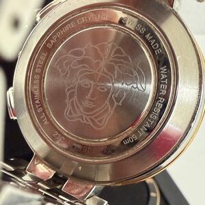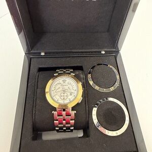 Sophisticated Versace watch with 3 options for bezel change out. Perfect for adding luxury to your look. Just needs a new battery. Original links and pins come with.
