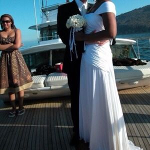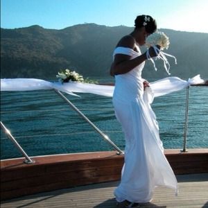 This once worn authentic Versace dress is a rare beauty. I bought it a few years ago for my wedding. It was the only white dress they had in the entire store. Luckily it fit. I bought it from the Versace store on Rodeo Drive. The dress was perfect for my yacht style wedding. It's a beautiful dress for the outdoors. Not too heavy & bulky. It's also versatile enough that it can be worn for any formal event. It's definitely very classy and the detailing is to die for. You'll love this purchase.
