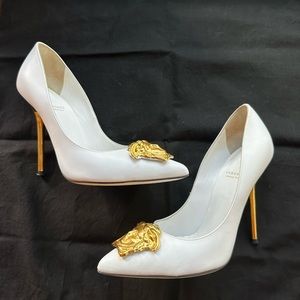 Versace pumps in crisp white leather with gold heel & iconic Medusa motif
