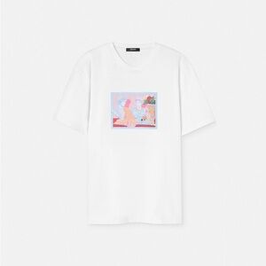This Versace tee showcases a minimalist design with a striking graphic print on a classic white base. Crafted from soft cotton, it features a crew neckline and short sleeves, making it a versatile addition to any wardrobe.