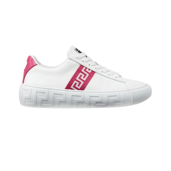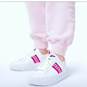 Elegant sneakers with a white base and vibrant pink details. Features signature Greek key design on the sole. Ideal for everyday style. These do not come with the box. Purchased on here worn once