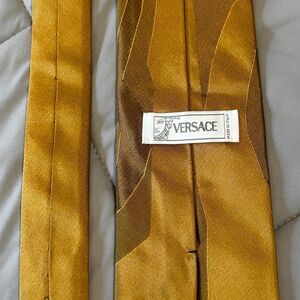 Luxurious Versace tie featuring a rich gold and bronze swirl pattern with the iconic embroidered Medusa logo near the tip. Crafted in Italy from 100% silk (Seta / Soie / Silk), this tie exemplifies Versaces signature baroque elegance and high-quality Italian tailoring.
