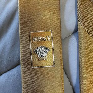Versace XL Gold Silk Tie Abstract Swirl Medusa Logo Made In Italy 67"L x 3.75"W