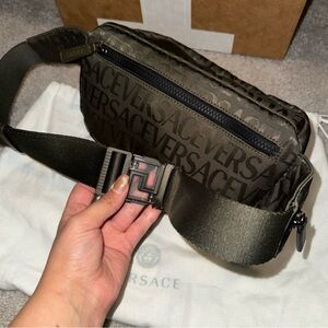 NWT and dust bag this nylon Versace all over belt bag/bum bag. Adjustable strap so you can wear around waist or across chest. Multiple zipper pockets. Color appears brown when photographed but it’s a deep olive/army green. Measurements: