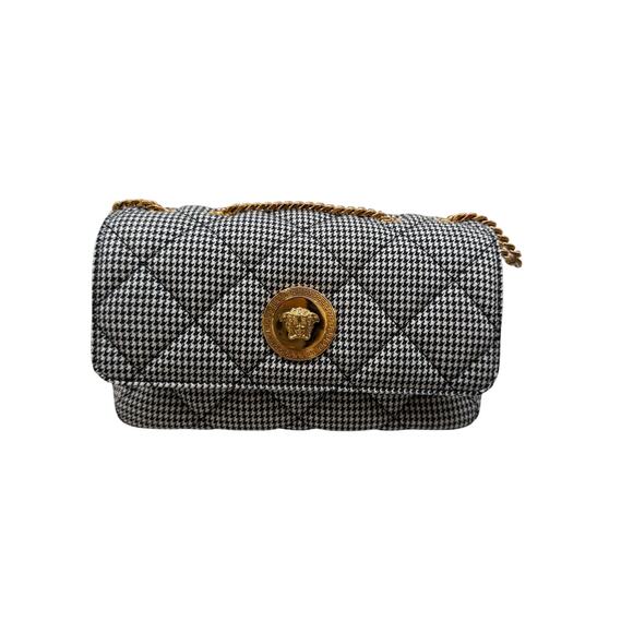 Unused Versace classic flap bag fabric mixed with leather, gold chain can be crossbody or shoulder bag, comes with dust bag, no box