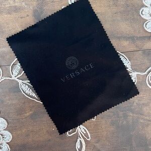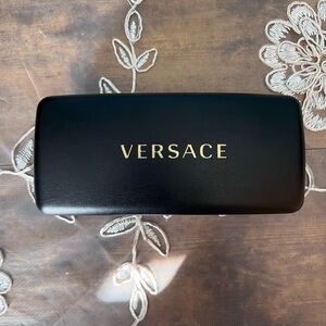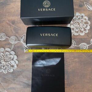 Versace black sunglass box, with gold lettering, black sunglass case with gold lettering and black sunglass lens cleaning cloth. Brand new never been used.