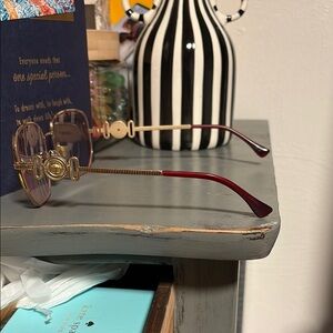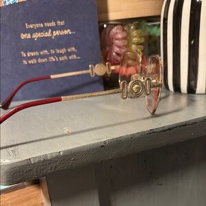 Stylish versace frames featuring a chic gold frame with red accents. Perfect for adding a touch of elegance to any outfit. Can put own prescription lenses in frames. Used condition