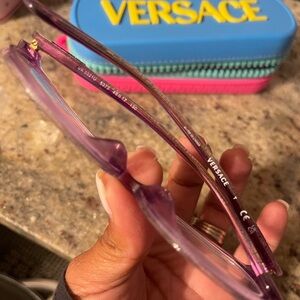 Chic pink glitter glasses. Includes a vibrant blue case with yellow Versace branding.