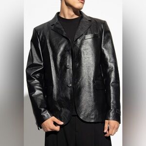 Versace injects an edgy attitude into tailoring for their SS22 runway collection. Black leather is used to realise this single-breasted blazer jacket, and a gold-tone Medusa strap detail adds a refined branded finish to the look.
