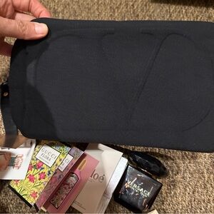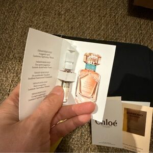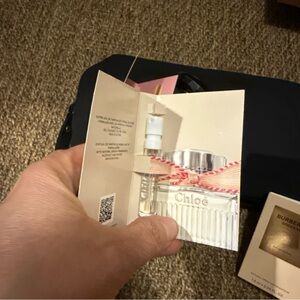 bottle is half used with a variety of samples. Includes Gucci, Chloé, and Burberry samples. And Valentino makeup pouch Elegant and diverse scent collection.