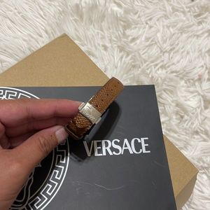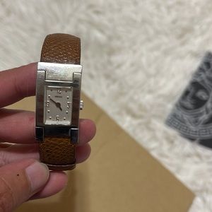 Women’s Versace rectangular watch. The watch is in Fair condition. Hairline scratches on the bezel, case and sign of usage in the band but still beautiful.