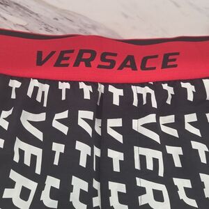 Stylish Versace swim shorts featuring a bold black and white pattern with a striking red waistband.