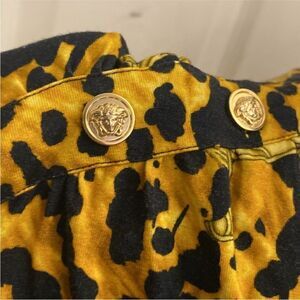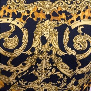 This Versace dress showcases a luxurious gold and black baroque print, perfect for casual or work settings. The sheath style is complemented by short dolman sleeves and a sophisticated bateau neckline, offering a chic and timeless silhouette. The midi length adds a touch of elegance, making it a versatile addition to any wardrobe. Excellent condition, worn once