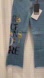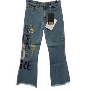 denim, print, brand logo, solid colour with appliqués, high waisted, wide leg, comfort fit, 1 button, zipper closure, multipockets, raw-cut hem, stretch, medium wash.small sized.
