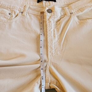 These gorgeous cropped jeans have nice stretch. The inseam is 27", and the total length is 37". Waist is 19" laying flat. These are a very pale yellow/cream color. EUC. B60.00221