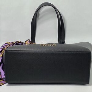 A spacious tote bag with a lobster clasp and scarf will go well with any casual outfit.