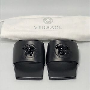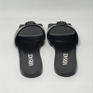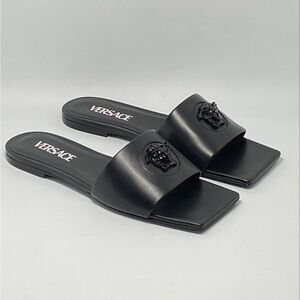 Tonal Medusa head embellishment adds a subtle logomania touch to these buttery-soft leather slides.