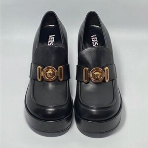Goldtone logo hardware adorns the strap of these Versace '60s-style leather loafer pumps, designed with a platform sole.