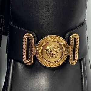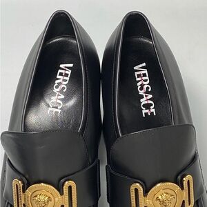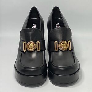 Goldtone logo hardware adorns the strap of these Versace '60s-style leather loafer pumps, designed with a platform sole.
