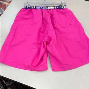 Vibrant pink shorts with iconic blue and gold waistband. Stylish and comfortable. Perfect for casual wear.