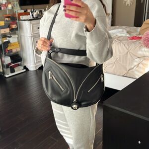 This is an all black leather Versace hobo bag brand new. The hardware is silver. Comes with care card and dust bag. Also has an extra strap so you can either use the bag in shoulder or remove that strap and use the longer one and make it crossbody. 100% authentic.