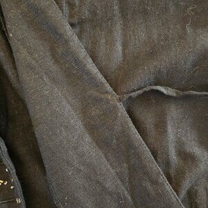 Black linen, long sleeves. Closes with hook and eye at neckline, and a black cord at middle.