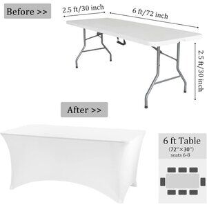 Features: These fitted spandex table covers fit snugly on 6-foot rectangular tables, thanks to the deep elastic pockets that prevent slipping and blowing away. Made of a stretch fabric blend that’s durable, washable, and stain-resistant, perfect for transforming your space effortlessly.