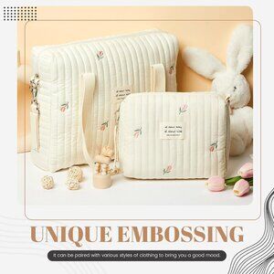 Features: Light and spacious cotton tote with quilted trim and adorable tulip design, perfect for carrying all your essentials. Comes with a matching small bag for toiletries or snacks. Stylish, lightweight, and multipurpose—use it for diaper duty, beauty essentials, or daily organization.