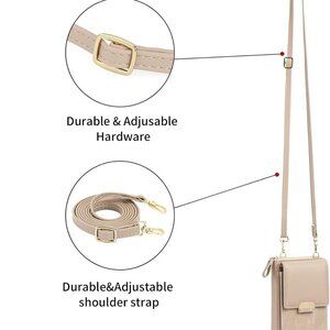 Features: Small but surprisingly roomy, this synthetic leather phone wallet fits phones up to 6.5 inches (without case) and has plenty of space with one main phone pocket, two zippered compartments, six card slots, and inner sections. It comes with two sturdy metal hooks and an adjustable strap, giving you options to wear it as a crossbody, shoulder bag, or clutch.