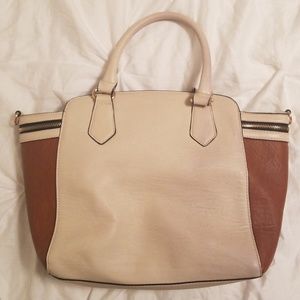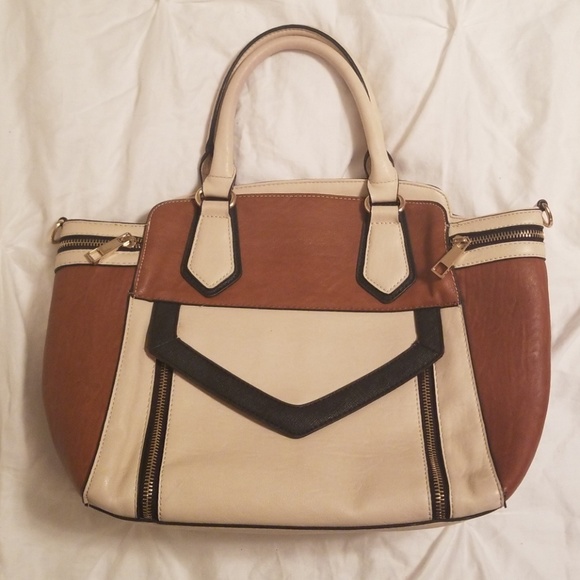 Chic Aldo handbag featuring cognac brown, cream, and black with silvery-gold hardware and zipper accents. You can match anything with all these neutrals! One exterior front flap pocket. Two interior sleeves, one interior zipper pocket. Entire interior zips closed!
