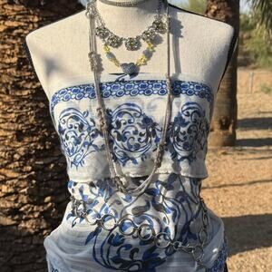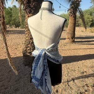 blue and white pattern, lightweight polyester, multiway scarf, boho accessory, wardrobe staple, elegant wrap, headwrap, belt accessory, versatile styling, chic fashion