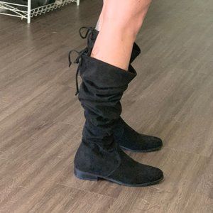 Suede or suede-like material. Only worn once! These can be adjusted from knee high to slouchy mid-calf.