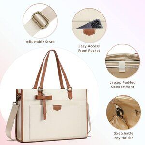 Features: This spacious laptop bag measures 15.8 inches in length, 12 inches high, and 5.4 inches deep. It includes a padded compartment for laptops up to 15.6 inches and a dedicated slot for your 10.9-inch iPad. Plus, it comes with a stylish makeup bag and a wristlet for extra organization. The smooth zipper secures all your essentials, and the gold-finish bottom studs add a touch of elegance. Crafted from lightweight, durable canvas with PU leather accents, it feels soft yet resistant to wear.
