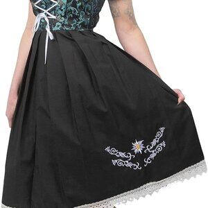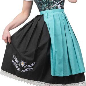 Features: This 3-piece dirndl set includes a crisp white crop top blouse, a beautifully embroidered black dirndl dress with Edelweiss flowers, and a vibrant aqua apron. The dress features intricate embroidery with backing for durability, plus delicate lace details on the bust and hem for a touch of femininity. Perfect for blending traditional German style with a bit of modern glam, great for Oktoberfest, Halloween or any fun festivity.