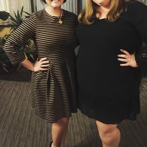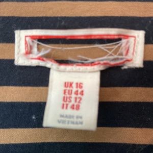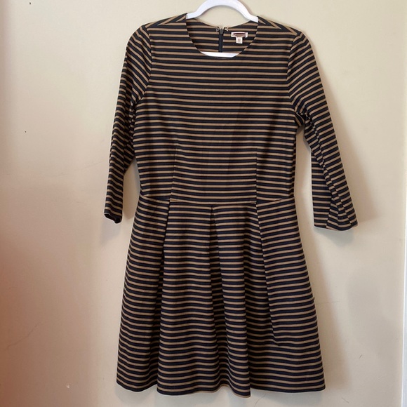Nice quality and versatile- I’ve worn it to interviews and to a wedding. Not sure on the brand as the tag was cut out (purchased at a warehouse type store. I’m guessing maybe Gap as pictured in the other tag. Fitted in the bodice and really pretty the way the skirt hangs (see picture from wedding). Pet friendly home, good used condition- no blemishes or fading, zipper works. Armpit to armpit: 19.5 inches Shoulder to midsection: 18 inches Midsection to hem: 18.5 inches